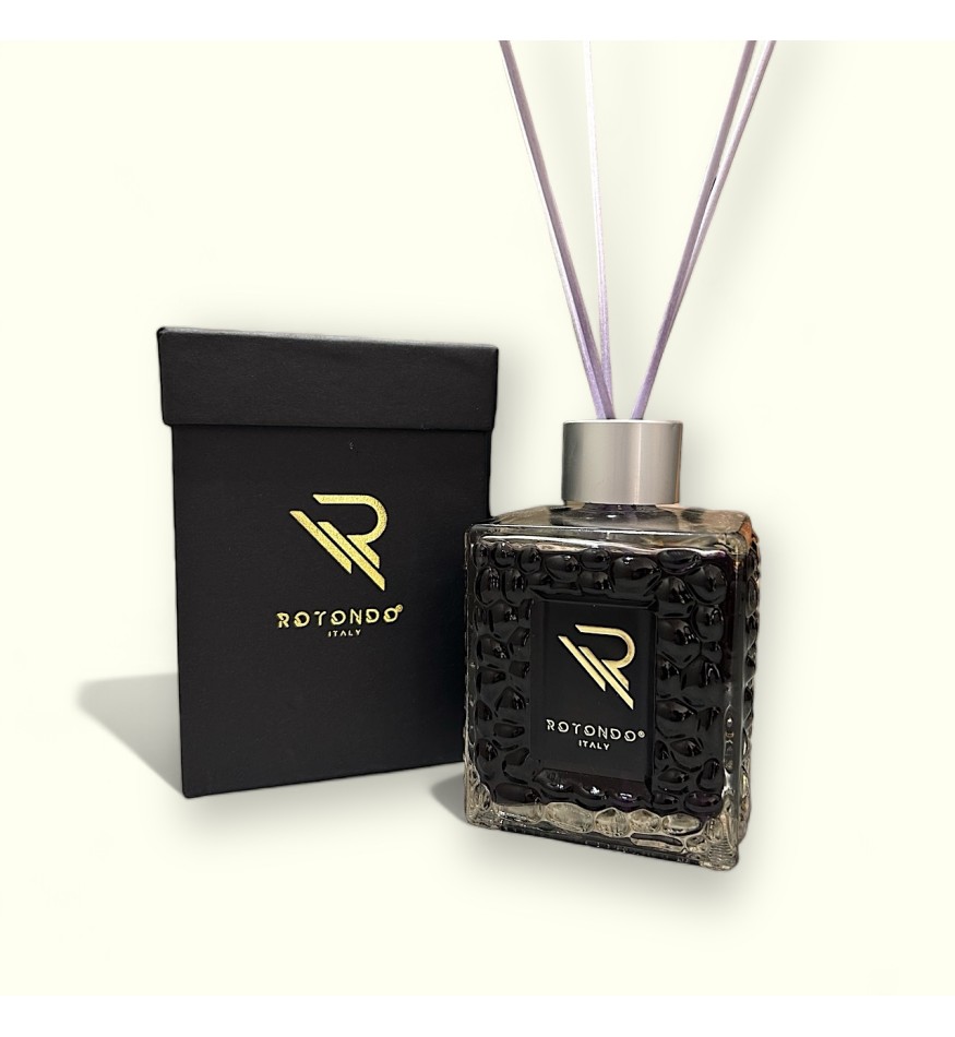 PROFUMATORE AMBIENTE DA 500ML CON BACCHETTE E SCATOLA ARTIGIANALE CON STAMPA IN ORO.